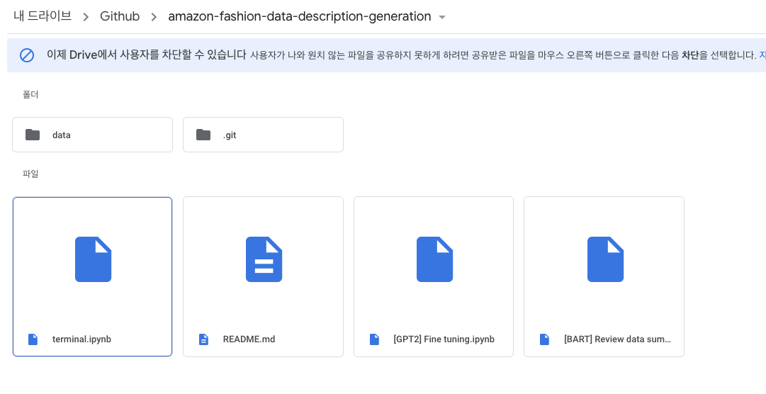 - ์ ๋ amazon-fashion-data-description-generation ์ด๋ผ๋ Github ๋ ํผ์งํ ๋ฆฌ๋ฅผ Google Drive ์ 'Github' ํด๋ ์๋์amazon-fashion-data-description-generation ํด๋ ์๋์ clone ํด์ค๋ คํฉ๋๋ค. (๋ ํผ์งํ ๋ฆฌ๋ณ๋ก ์์๊ฒ ์ ๋ฆฌํ๊ณ ์ถ์ด์!)