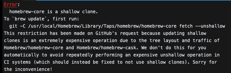 2020๋ 10์ ๋ถํฐ HomeBrew๊ฐ ๋์ด์ Shallow clone์ ์์ฑํ์ง ์๊ธฐ ๋๋ฌธ์ ๋ฐ์ํ๋ ์๋ฌ