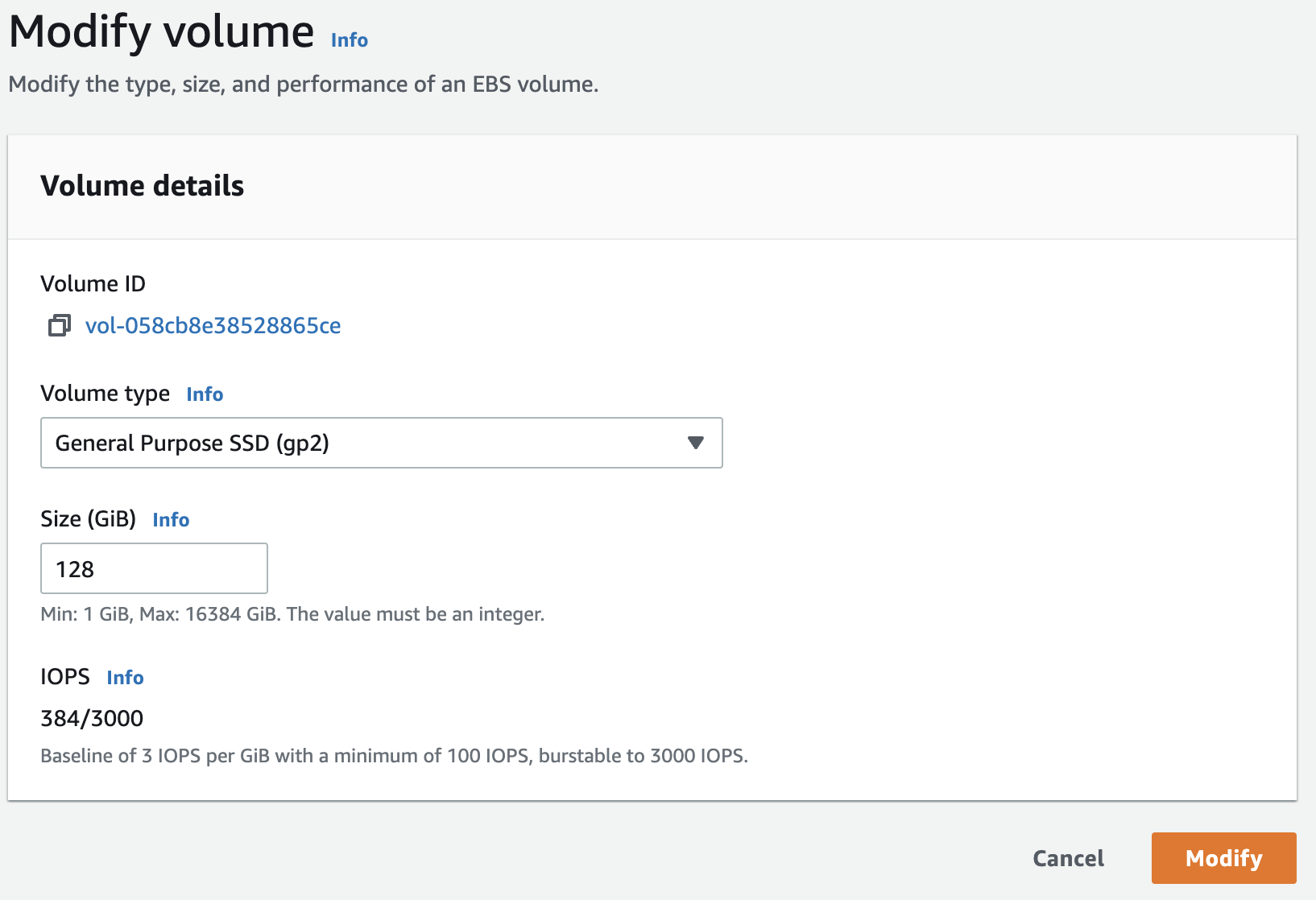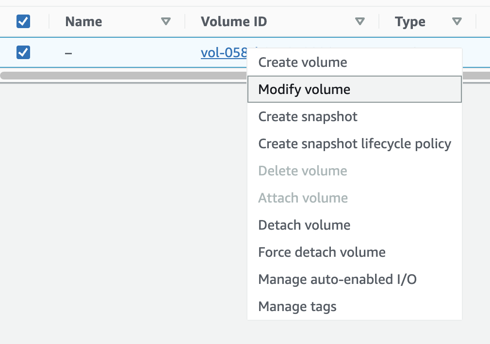 2. Storge > Volumne ID ํด๋ฆญ > ์ฐํด๋ฆญ > Modify volume