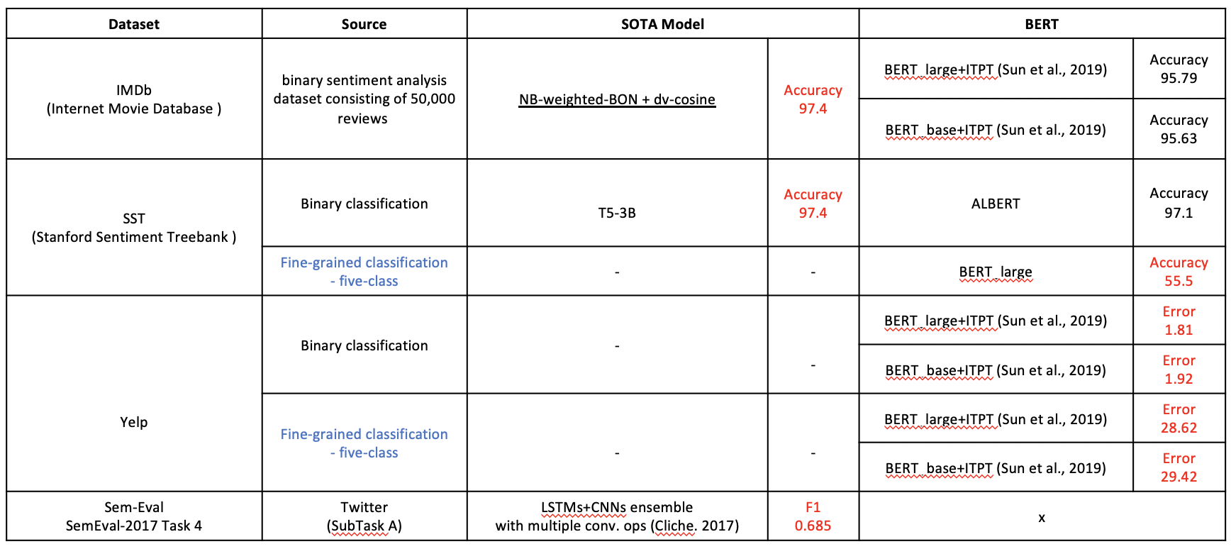 ๊ฐ ๋ฐ์ดํฐ์ ๋ค ๋ง๋ค SOTA ๋ชจ๋ธ๊ณผ ์์ฆ ๊ฐ์ฅ ํซํ BERT ๋ชจ๋ธ์ ์ฑ๋ฅ์ ์ ๋ฆฌํ์ต๋๋ค.