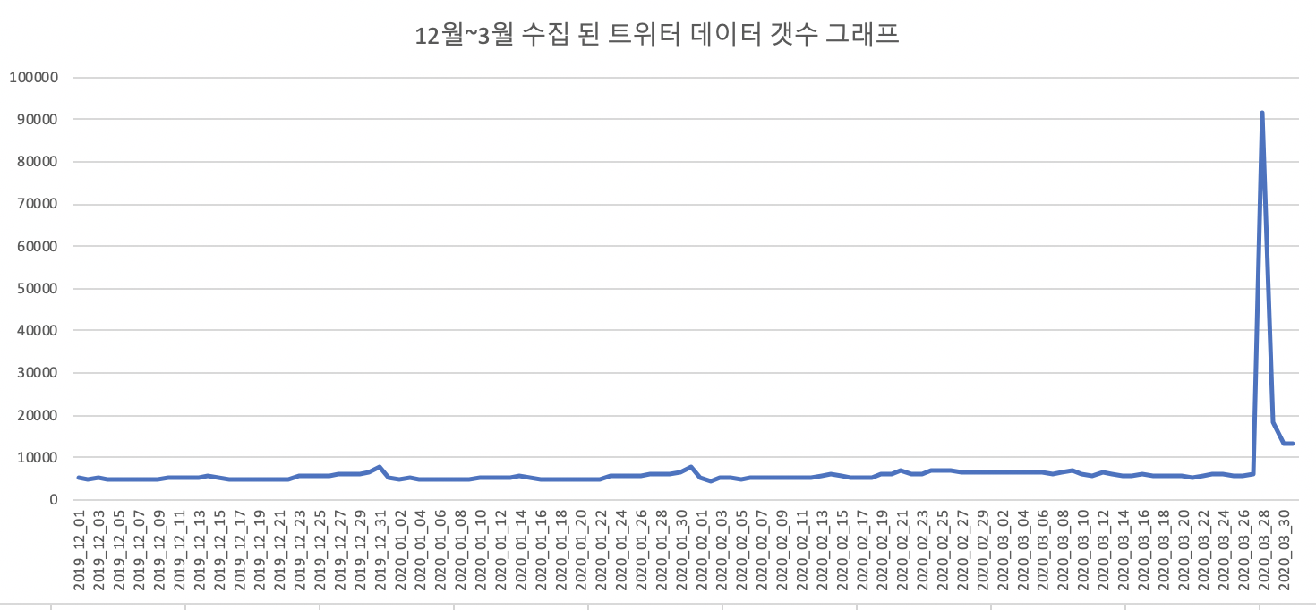 ๋ค์์ ์์ง ๋ ํธ์ํฐ ๋ฐ์ดํฐ์ ๊ฐฏ์ ๊ทธ๋ํ ์ ๋๋ค.