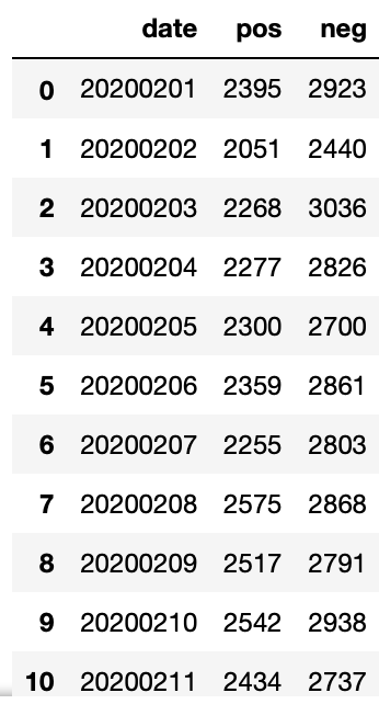 sent_count_result.columns=['date','pos','neg'] #column ์ด๋ฆ ๋ณ๊ฒฝ