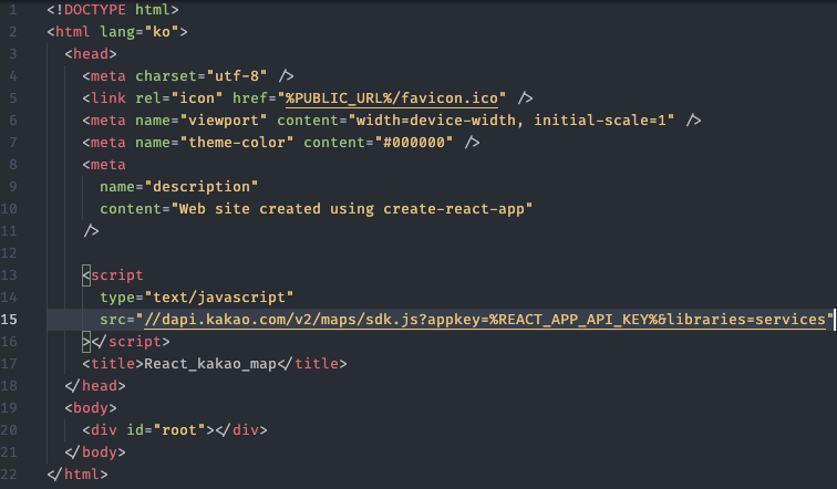 4) index.html ์ %REACT_APP_API_KEY% ํํ๋ก api key ์ ๋ณด์ถ๊ฐ